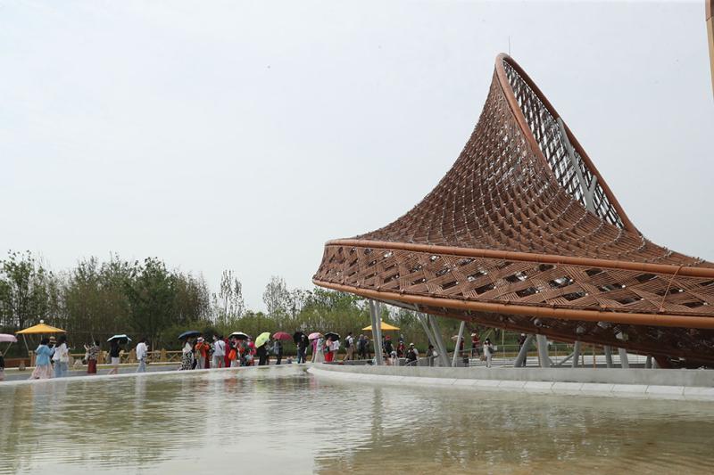 2021年5月31日,市民和游客在花博会园区参观竹藤馆。竹藤馆位于花博园内,主要展示竹藤产品并推广竹文化。