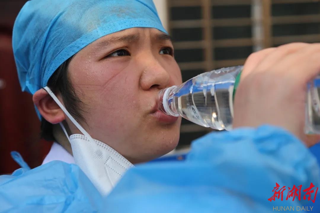 除了坚守在实验室中的检验人,益阳市第一中医医院还有奔赴各个采集点的核酸采集小分队。她们穿着厚重的防护服,冒着酷暑进行繁重的采集工作,汗水泡肿了手指,口罩勒红了脸庞,依然保持积极乐观的心态,坚守在抗疫最前线。