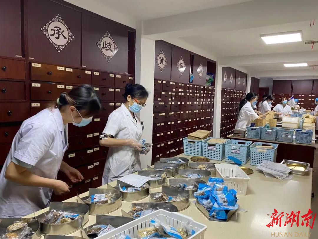 湖南日报·新湖南客户端8月5日讯(通讯员 王盼 詹磊)当前,疫情防控形势严峻,益阳市第一中医医院党委高度重视,充分发挥自身优势,组织曹国立名中医工作室根据病毒变异与季节的关系研创了新的“预防时疫汤”方剂,药剂科工作人员加班加点熬制中药。取药、称药、配药、泡药、煎药……有条不紊。一批批中药汤剂熬成后及时装桶、打包,源源不断地送到奋战在疫情防控一线的医务人员、工作人员手中以及有关单位。