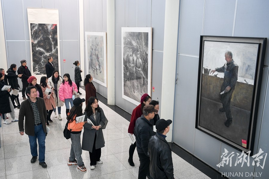 12月15日,观众在观看展览。展览集中展出了由湖南省群众文化学会美术专业委员会荣誉会长、理事与优秀会员选送的七十件精品,涵盖油画、国画、水彩、版画、雕塑等类别,是湖南美术历史进程的精妙呈现。