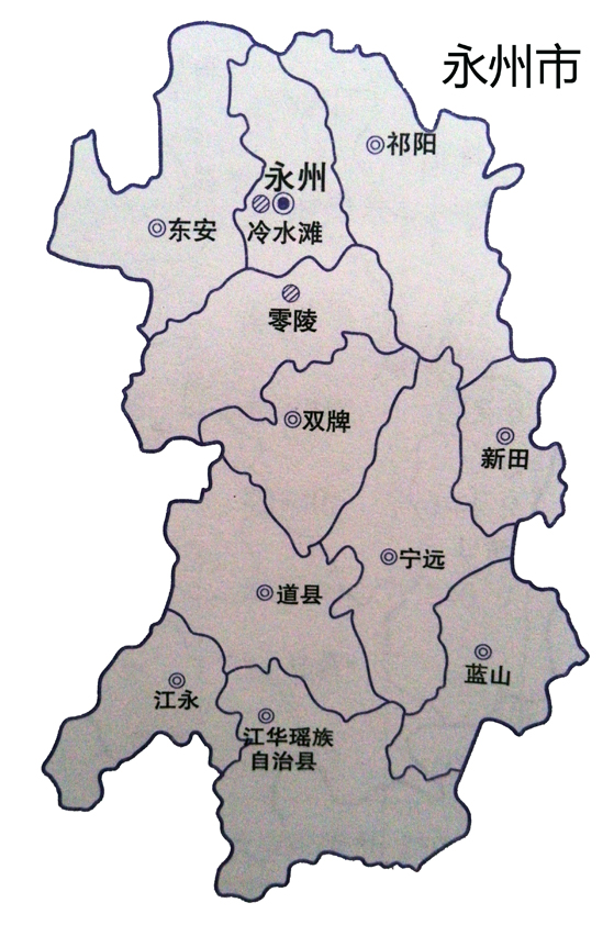 永州(原湖南省零陵地区)于湖南省南部,潇、湘二水汇合处,雅称“潇湘”。永州东接郴州市,东南抵广东省清远市,西南达广西壮族自治区贺州市,西连广西壮族自治区桂林市,西北接邵阳市,东北靠衡阳市。永州下辖零陵区、冷水滩区二区及双牌县、祁阳县、东安县、道县、宁远县、新田县、蓝山县、江永县、江华瑶族自治县九县,另设有回龙圩、金洞管理区。