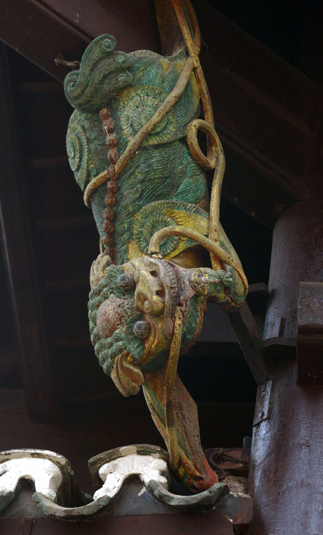 穿过戏楼下的庙门回首,这座歇山顶的朱红楼阁式建筑高矗眼前。戏楼共有三层,底层架空,四面通透,是经庙门进出的通道。二层戏台宽敞,宽达20米,高14米,三面敞亮,楼阁正中是著名书法家何绍基所书“山水绿”的戏楼题额。戏楼台檐柱上端雕有麒麟、凤凰,一只牵绳嬉戏玩闹的麒麟神态尤妙,呼之欲出。台阁中则是一排栩栩如生的“九仙”塑像,除了吕洞宾,铁拐李,何仙姑等民间喜欢的“八仙”,还有一位太上老仙。因为在永州民间,人们将柳宗元看做是太上老仙下凡。