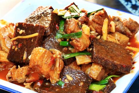 2、 鸭血粑先煎过再炖煮,就不容易散掉。