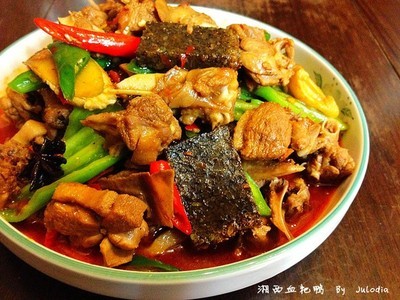 【凤凰血粑鸭由来】 凤凰血粑鸭原本是湘西苗民在过节之时敬献给他们的首领----苗王的一道菜肴,其采用湘西农家野外放养的特有麻鸭品种,主食为玉米、稻谷,肉质鲜嫩,辅以选料讲究的湘西高山糯米,加以鲜鸭血精致血粑,佐以生姜、天然香料等精致而成的一道御用菜。血粑鸭在凤凰几乎每家餐馆的招牌菜, 血粑鸭,这是凤凰特色且美味的一道待客菜!