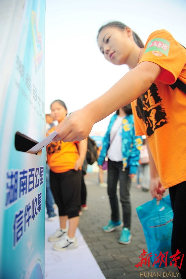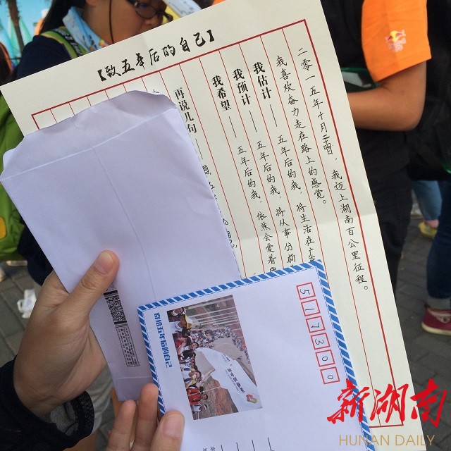 本次活动特别推出以“我就爱”为主题“写一封信给五年后的自己”。信件在湖南百公里起点收集,组委会将所有信件妥善留存,信件于2020年9月1日进行投递。来自湖南工业大学的魏维志告诉记者,信中主要是写了自己对未来的憧憬,五年后自己收到信时,能回头看看这时的美好愿望是否能实现。
