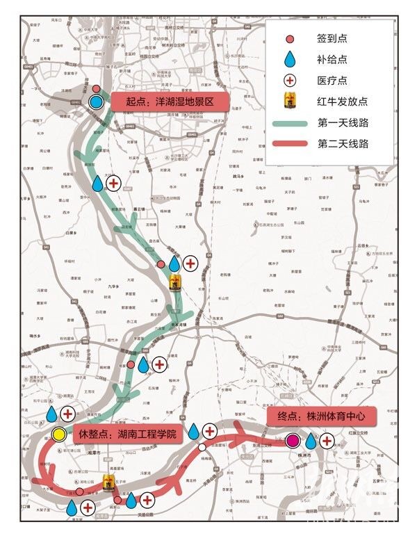第二天:湖南工程学院——上湘江江堤——湘钢钢材码头——狮灵港——湘潭二桥过江——下桥上湘江大堤沿湘江上行(免费路餐发放点)——龙船洲——排棚子——株洲体育中心(终到点)