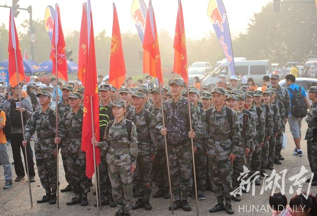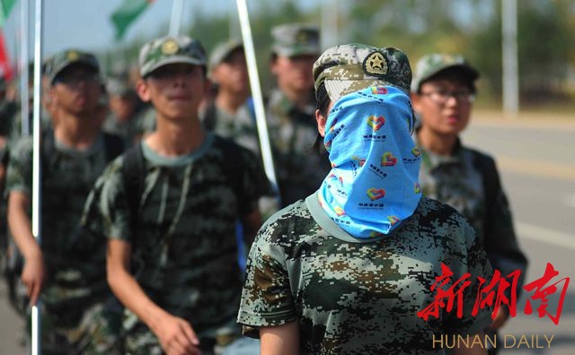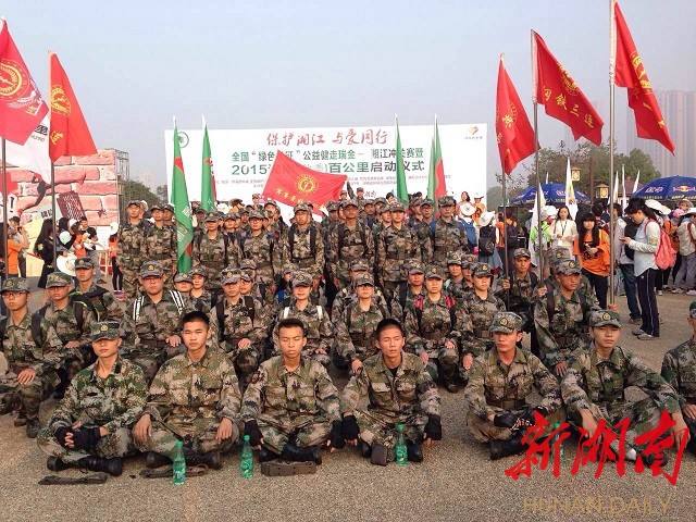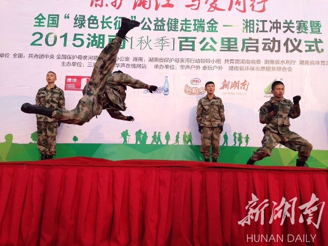 在现场,有一支庞大的队伍——中南林业大学的军事爱好者协会。别看他们英姿勃发,平日其实都是文弱理工男,其中一位协会成员是中南林业科技大学电子信息工程系的赵珊,他说:“在百公里前,我们用擒敌基础表演为6000位毅行者壮行。”