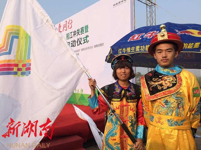 公益是百公里毅行的重要内涵。在现场,一位扮成“项羽”的旗手希望通过新湖南客户端传达他保护湘江的呼吁。