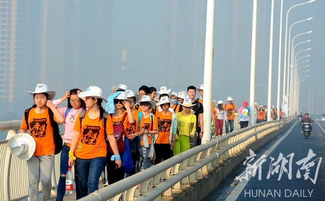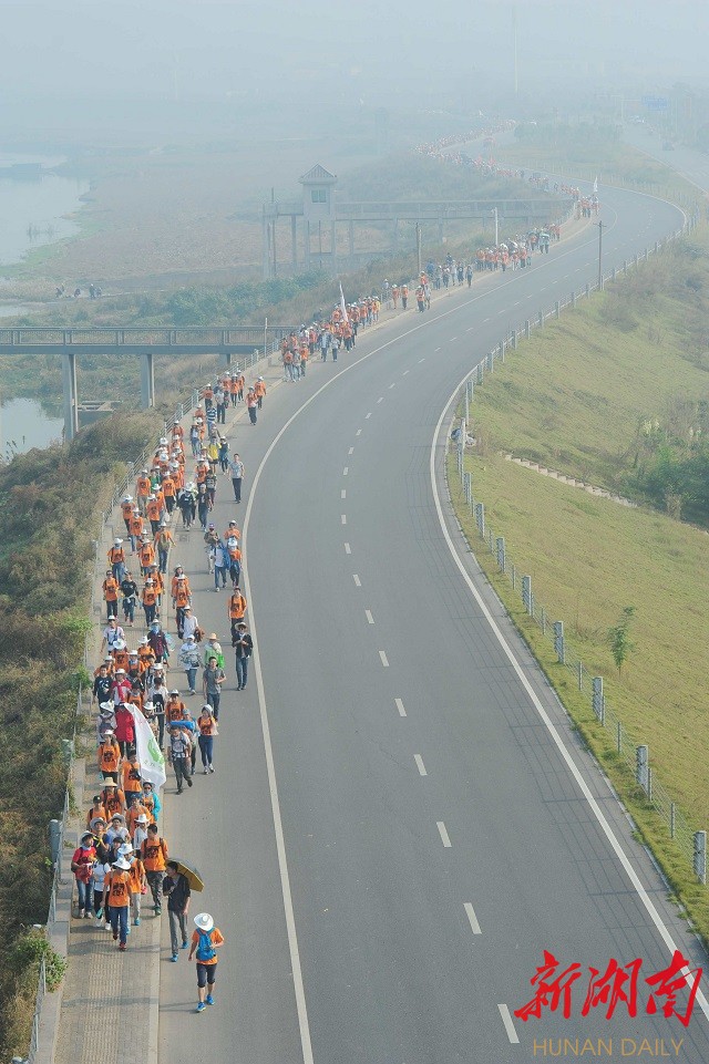 新湖南客户端10月24日讯 2015湖南(秋季)百公里首批于今日从长沙洋湖湿地公园开拔,前往湘潭。湖南百公里为中国规模最大的长距离徒步活动,自创办以来,先后有超过8万人完成了这一令参加者引以为傲的征程。