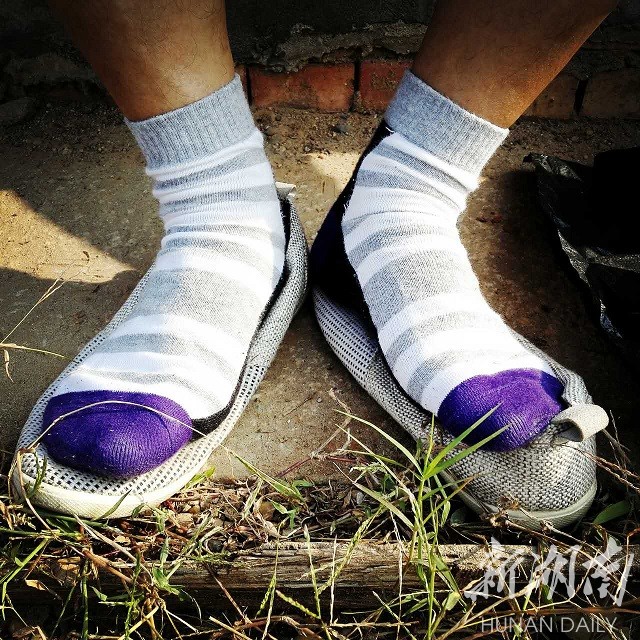 李建发叔叔嘴上说不累,可他脱了鞋子在这坐得都不想动了——