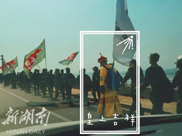 装扮成项羽的丁文翰来自湖南林科大,作为旗手之一,他希望有更多的同学参与到活动中来,实地感受母亲河湘江的情况,也希望楚霸王的形象能在百公里的过程中为同学们带来前进的动力。