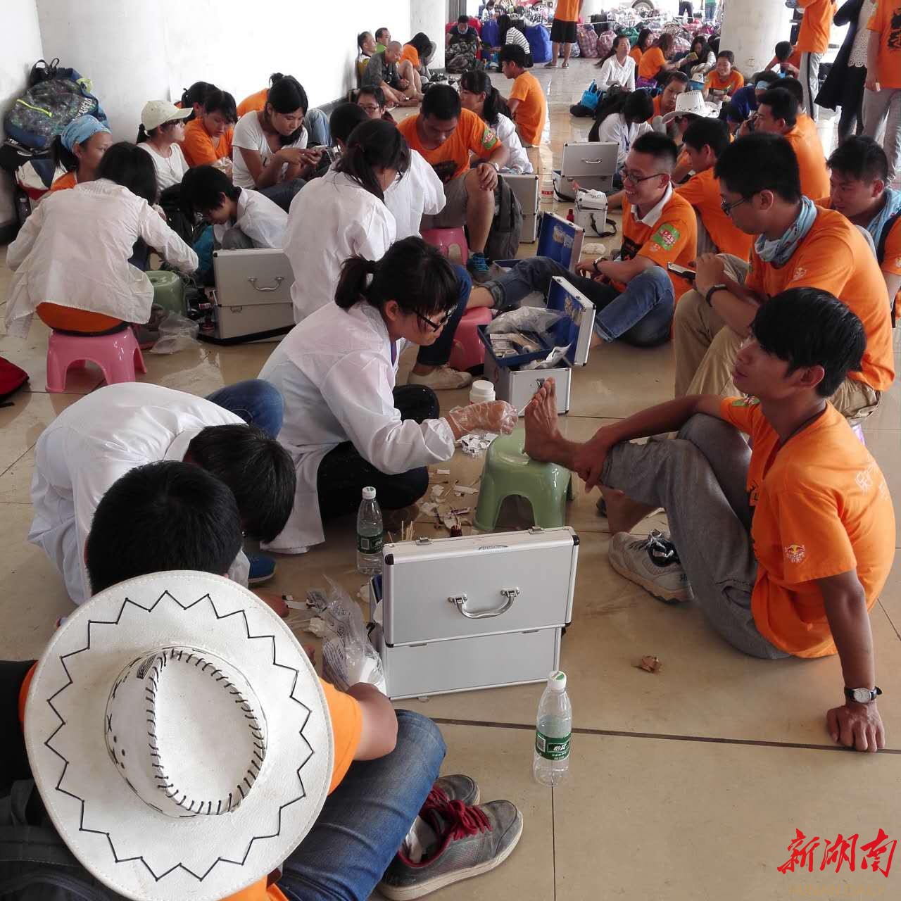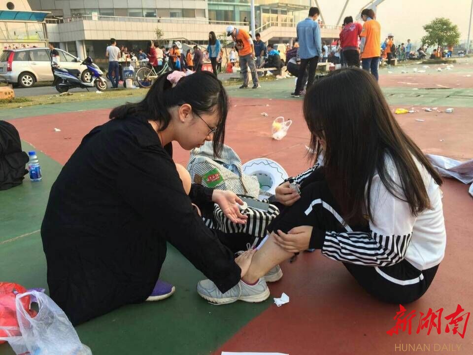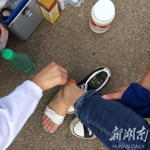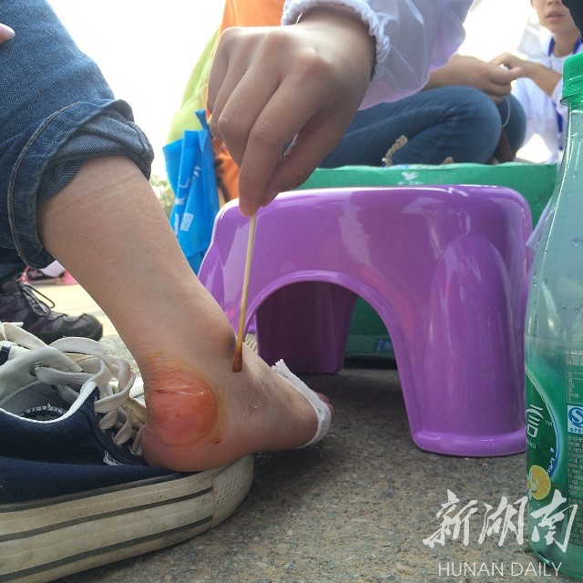 下午4点,在第三个签到点,还有10公里就抵达今天的终点——湖南工程学院了。可平常文弱弱的妹纸脚上的泡层出不穷,签到点的医务志愿者表示“挑都挑不赢”。