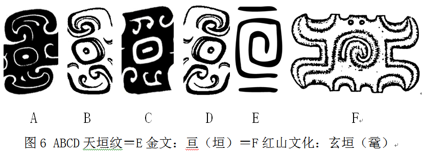 天垣纹不仅见于西周青铜器太极圆图、太极方图的中心,而且是商周大量青铜器的独立纹样。而其最早源头,则是上古黄帝族的红山文化勾云形器(图6F),因为夏商周统治者都是黄帝族,都是“黄帝轩辕氏”。上古黄帝族把标示北极天象的勾云形器,称为“玄垣”,拟形为“玄鼋”,中古以后称为“轩辕”(详见张远山即出新著《玉器之道》)。“轩辕氏”(玄鼋氏),与“伏羲氏”、“神农氏”一样,都是氏族名,并非个人名。