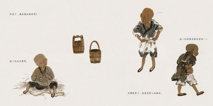我做“三个和尚”的故事,是因为我觉得在此可以存放一点传统的好物件,比如素朴,比如与自然相亲,比如勤劳和仁爱。“三个和尚”的故事来自民间一句俗语“三个和尚没水喝”。我觉得它够经典,因为它内里有对人性的洞悉。人性的弱点中有惰性、有私心,与生俱来,一点也不可怕。我们不满意的是它所体现出来的中国人三个人在一块没办法做事这种无奈。所以大家编书的时候都在为三个和尚找出路,什么样的情况下我们会团结,能超越私心,所以很多的《三个和尚》都有一种这样的设计:在灾难面前,大家会比较团结,所以三个和尚都离不开一场火。