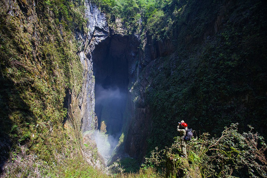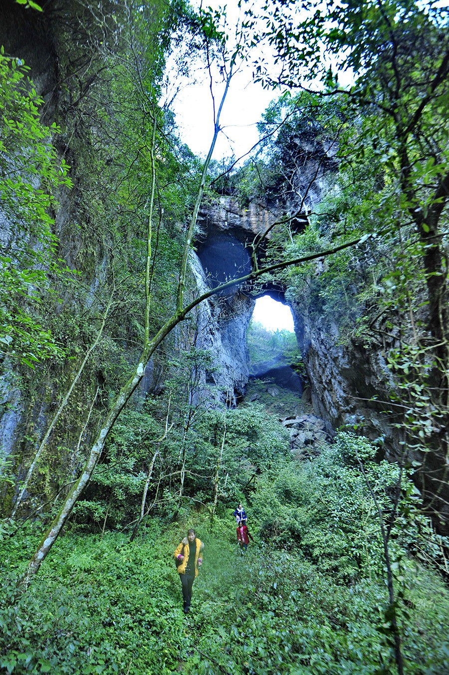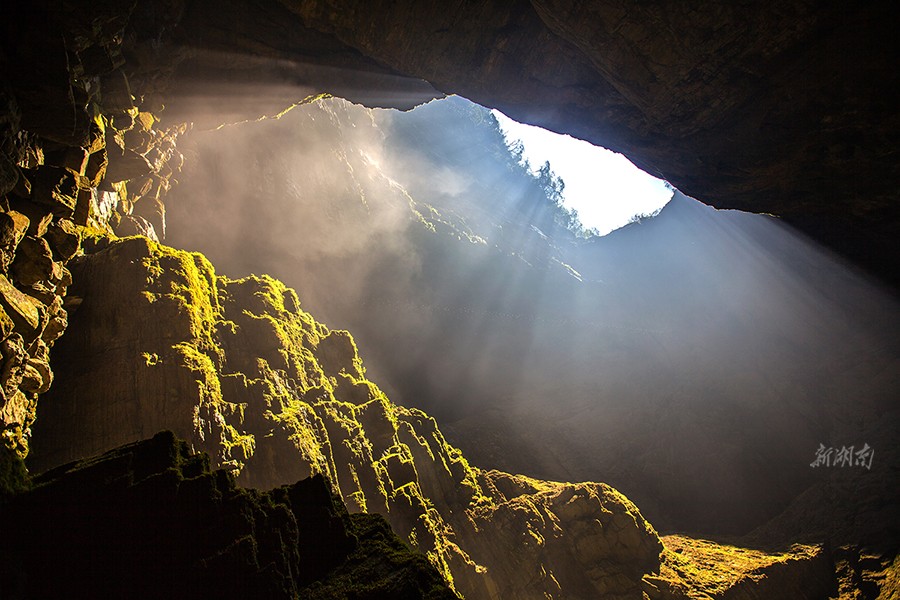 12月7日下午,石门县罗坪乡百丈峡天坑,底部的第一道天门隐藏在密林之中,后方还有深不可测的第二道天门,曾有人在洞中炼硝,也称硝洞坑。