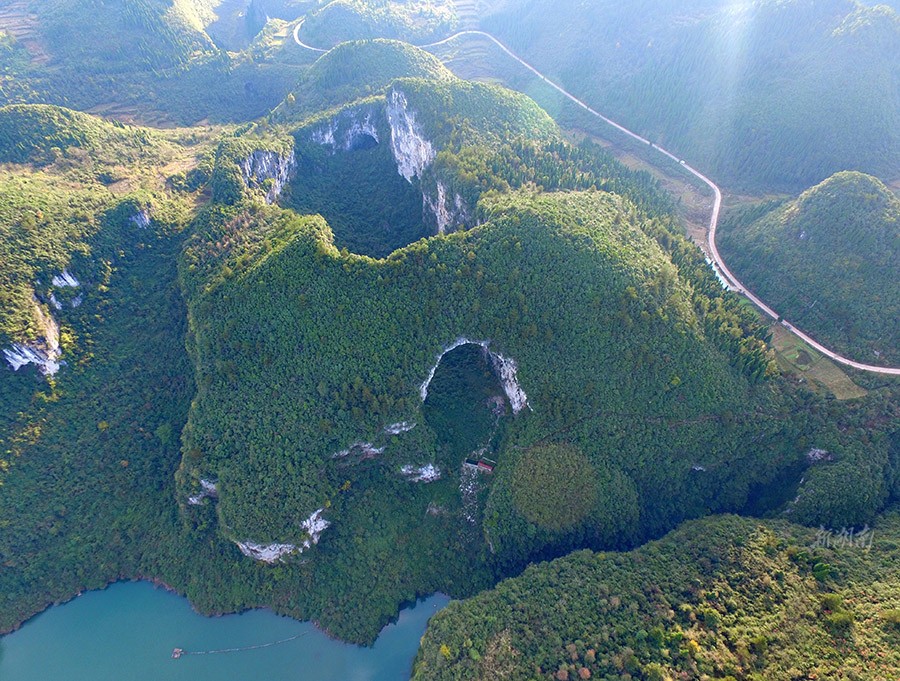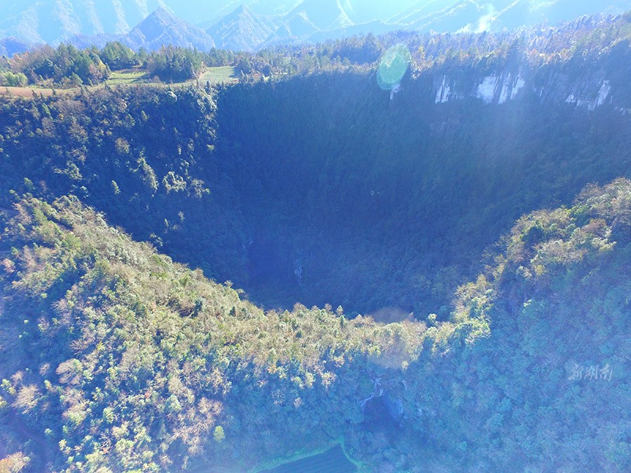 12月7日下午,航拍石门县罗坪乡百丈峡天坑。百丈峡天坑最深处达340米,直径达250米,呈圆筒状,四壁陡峻,底部与巨型溶洞相通,坑壁南侧因岩体溶蚀和岩壁崩塌作用,形成了高50米、宽20米、跨度达50米的天生桥。