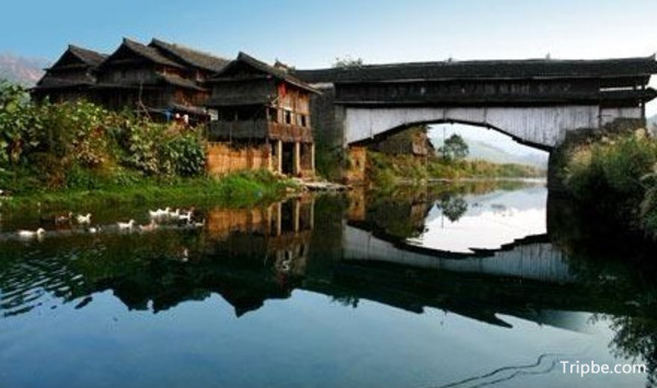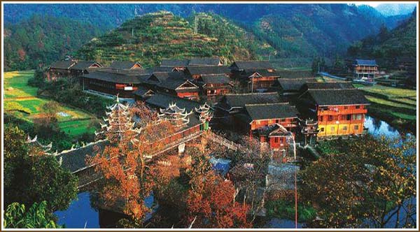 清澈的山溪穿寨而过,巍巍山峦形如芋头。200户侗家人分7个聚居点,依山就势,沿溪而建。寨形似龙,鼓楼为龙首,民居是龙身,风雨桥作龙尾。寨门、戏台、凉亭、萨岁堂、古墓葬等一应俱全。