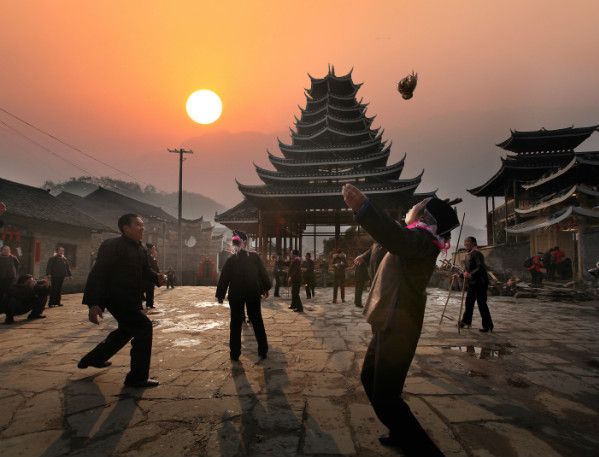 (芋头侗寨的村民在鼓楼前嬉戏。)