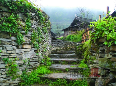这个寨子竟是高高地雄踞在海拔几百米高的山上,碎碎的石板路。片石堆起的围墙有大半个人高,进了围墙,就好像与世隔绝了。