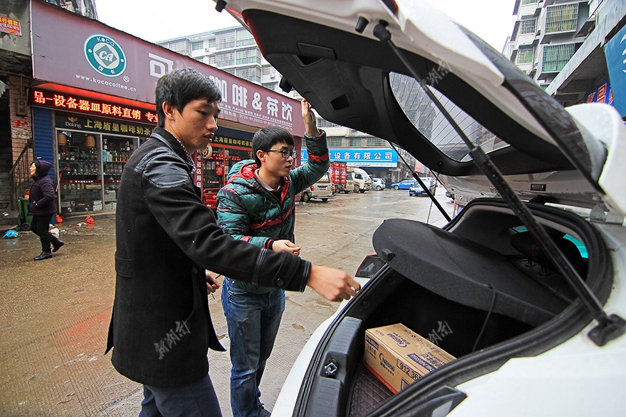 1月9日上午,蒋旭彤和王伟开了将近半个小时的车到市场采购,采购来源分为三个主要来源:水果市场,网上订购和超级市场,有了这辆车,他们省了很多事。