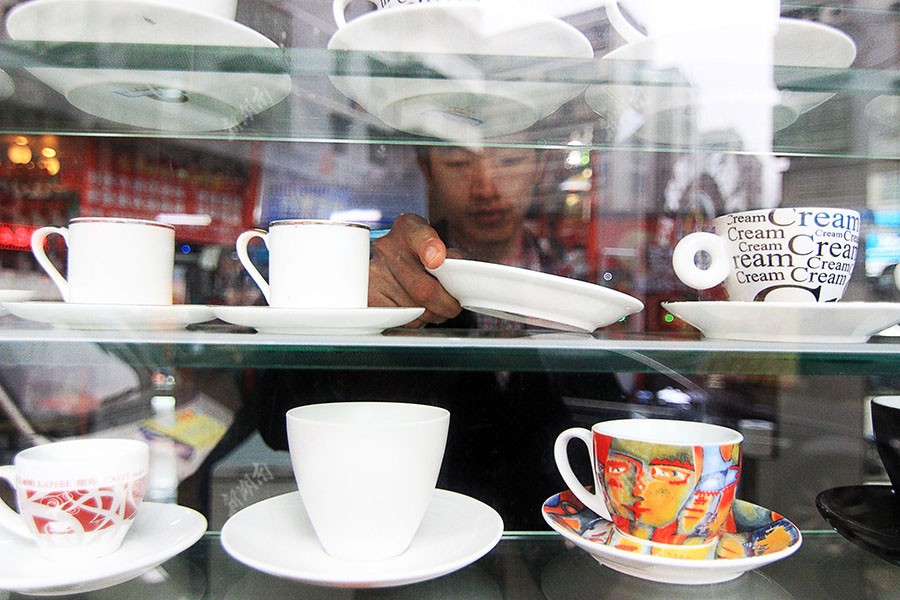 1月9日上午10点半,蒋旭彤正在挑选店内的餐具,店内的所有“文艺味”餐具都是他一一挑选的。