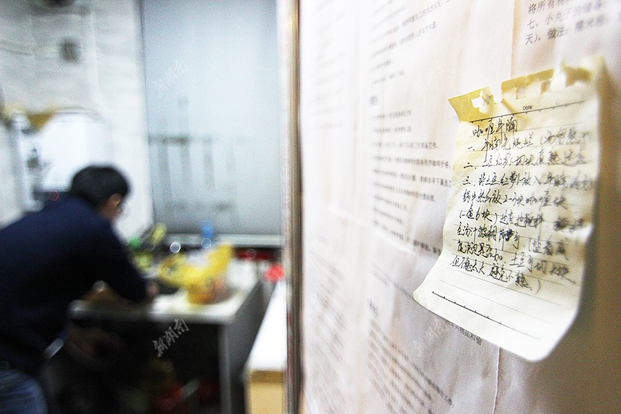 1月9日下午4点50分,王伟正在工作间做餐点,门上贴满了“早班早市开店流程”、“夜班打烊流程”、“卫生管理制度”……,这个“咖喱牛腩”的小便条都是他们在网上、书上摘录下来的,由于店内员工大多数是兼职学生,流动频繁,贴心得小便条,体现了咖啡店和谐的“店员文化”。