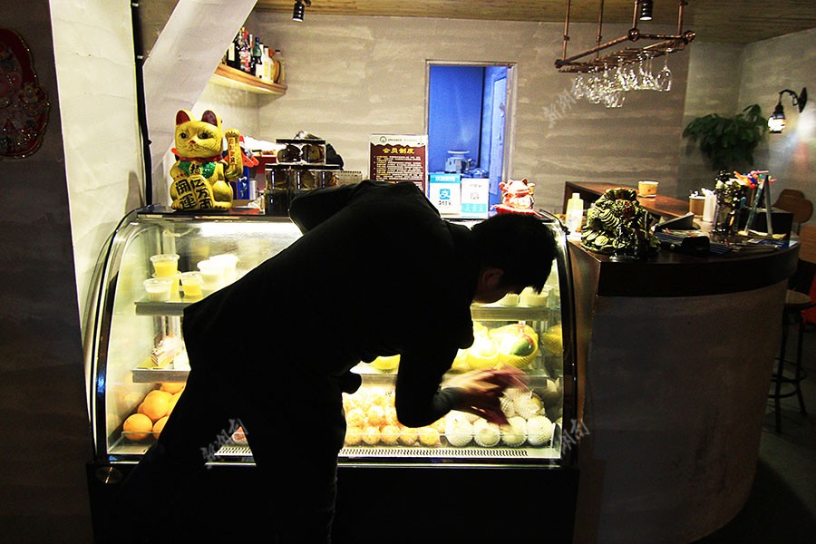 1月5日晚7点,黄海正在擦拭着水果柜的玻璃窗,为了保证饮料的质量和口感,冷柜里的水果经常会更新,他是店主,店里雇了在校大学生兼职,不过晚上顾客多的时候还得四个人一起忙碌。