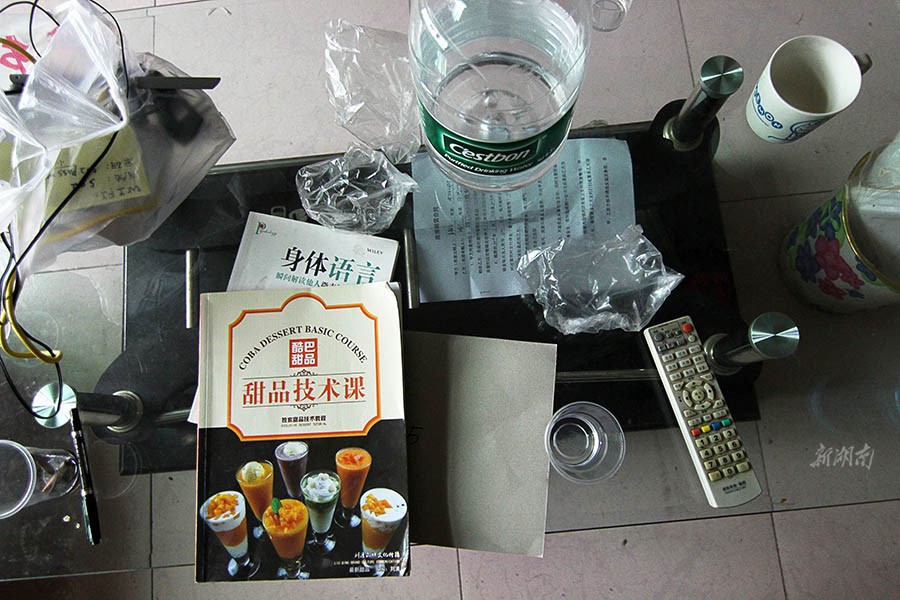 1月11日,出租房比较乱,只有简单老旧的一些家具,玻璃茶几上摆着《甜品技术课》、《身体语言》,2014年毕业后,他们通过自学和接受专业培训恶补了一年的经济学知识、甜品饮料技术才开始开店。