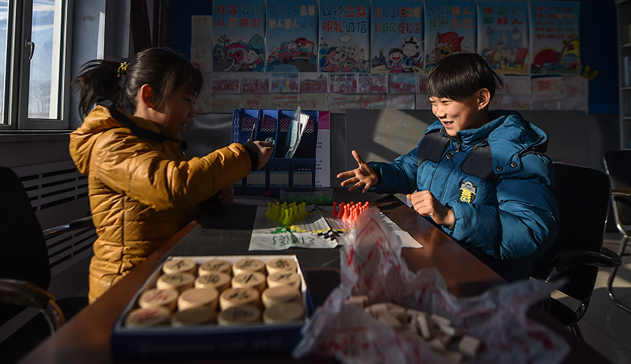 1月31日,长春市鹿乡镇鹿乡村10岁的留守儿童张志勇(右)在和小伙伴下跳棋。他的爸爸在外地做外墙保温工作,1年多没回家了。虽然妈妈常年陪伴在身边,但他仍希望一家三口在春节时能一起吃顿团圆饭。