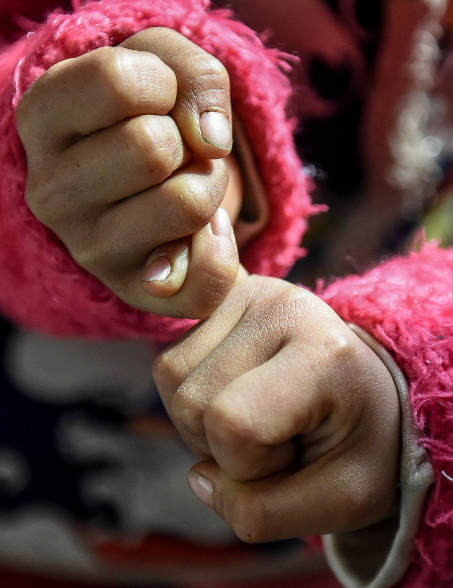 1月31日,5岁的双胞胎姐妹郭翔宇(下)和郭念宇(上)在模仿父母和她们约定回家的拉勾手势。她们的父母在长春市区经营一家超市,姐妹俩只能长期住在长春市双营子乡黄金村的“留守儿童之家”。想到爸爸妈妈下个星期就要回家,姐妹俩充满期待。