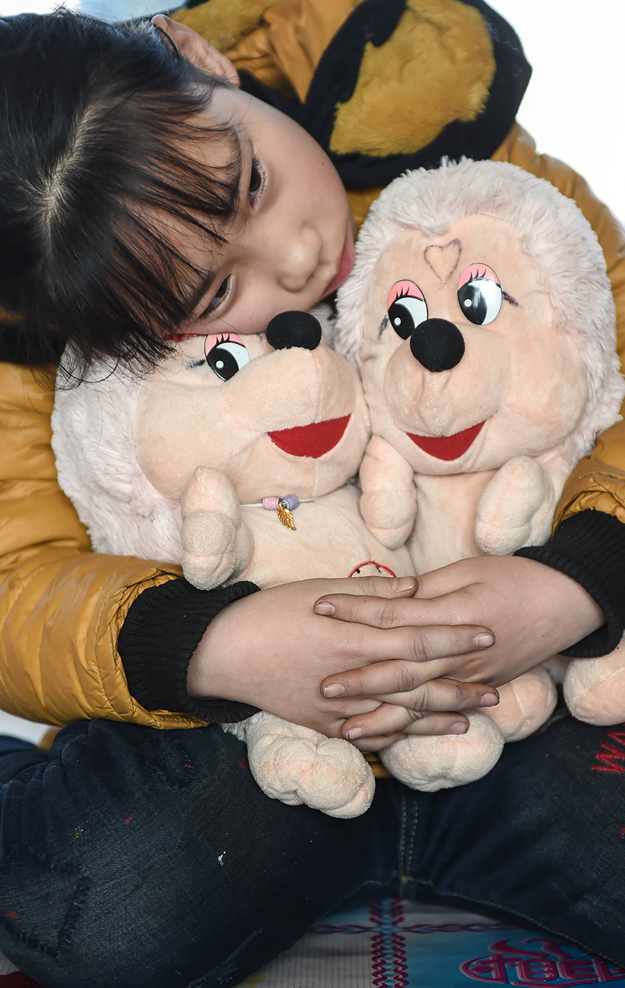 1月31日,长春市鹿乡镇鹿乡村11岁的留守儿童董斯彤在炕上抱着布娃娃。董斯彤目前和爷爷奶奶一起生活,她说:“爸妈回来陪我过年才是最好的礼物!”