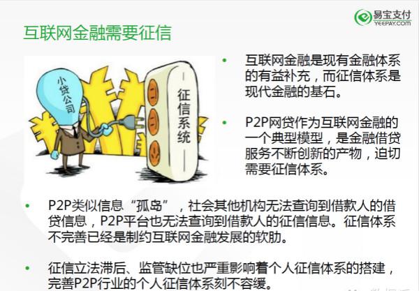 另一方面,今天的P2P平台是一个个信息孤岛,每个平台都在业务发展过程中积累了不少有价值的信用信息,但是相互之间缺乏信息共享。互联网征信可以通过信用数据联盟的方式,通过技术接口标准化、数据格式标准化等措施,广泛连接各个P2P平台,这就是云征信的努力方向。