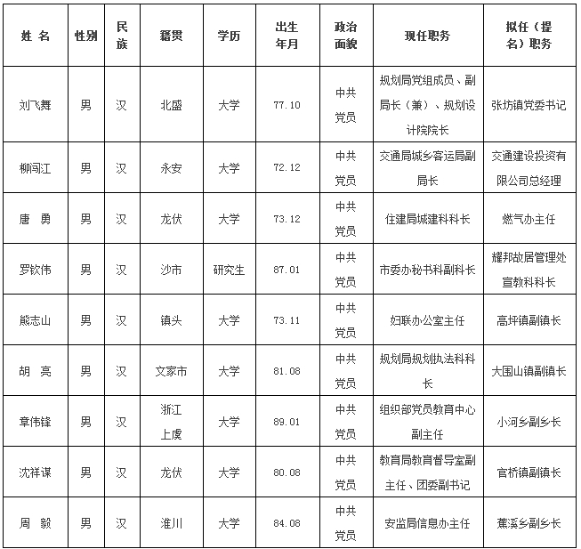 中共浏阳市委组织部今天发布干部任前公示,对经中共浏阳市委研究决定的刘飞舞等9名拟任职(提名)人选进行任前公示。