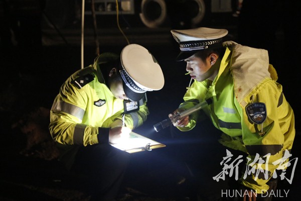 (湖南高速警察正在进行现场勘查及交通疏导等工作。)
