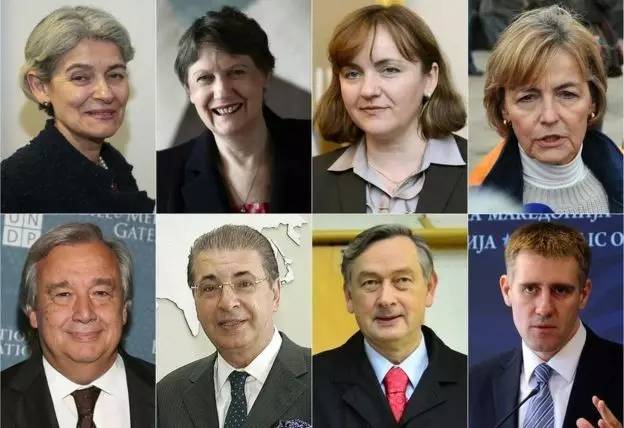 四名女性候选人分别是联合国教科文组织总干事、保加利亚外交官伊琳娜•博科娃,克罗地亚第一副总理兼外交部长韦斯娜•普希奇,摩尔多瓦第一副总理兼外交部长纳塔利娅•盖尔曼以及新西兰前总理海伦•克拉克。