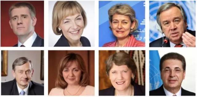 四名男性候选人则分别是联大前主席、马其顿前外长斯尔詹•克里姆,黑山副总理兼外交部长伊戈尔•卢克希奇,斯洛文尼亚前总统达尼洛•蒂尔克以及联合国前难民事务高级专员安东尼奥•古特雷斯。