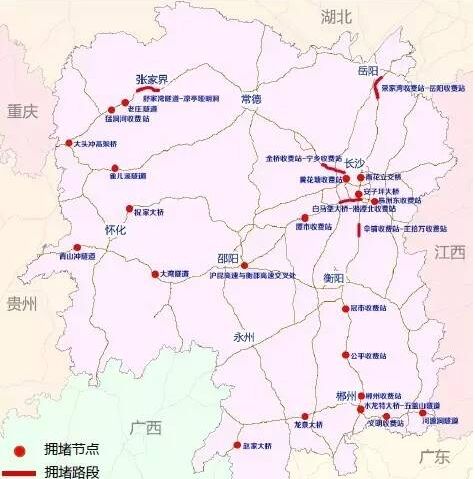 湖南高速公路易拥堵路段及站点为:长张高速长益、益常段;京港澳高速郴州、公平、冠市收费站,伞铺至王拾万收费站路段;长沙绕城高速西南、西北段等。