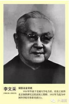 李文采,湘西永顺人,生于1906年,土家族,其父李烛尘是中国现代著名爱国实业家。1931年毕业于上海交通大学电机系,新中国建立以后,任西南军政委员会工业部副部长、轻工业部重庆工业试验所所长。1954年专事钢铁冶金研究工作,到冶金部钢铁综合研究所任所长。1955年当选为第一批中国科学院技术科学部委员(1994年改称院士)。1998年被国务院授予中国科学院资深院士称号。在钢铁研究院45年中,兢兢业业为中国冶金工业的发展努力工作。