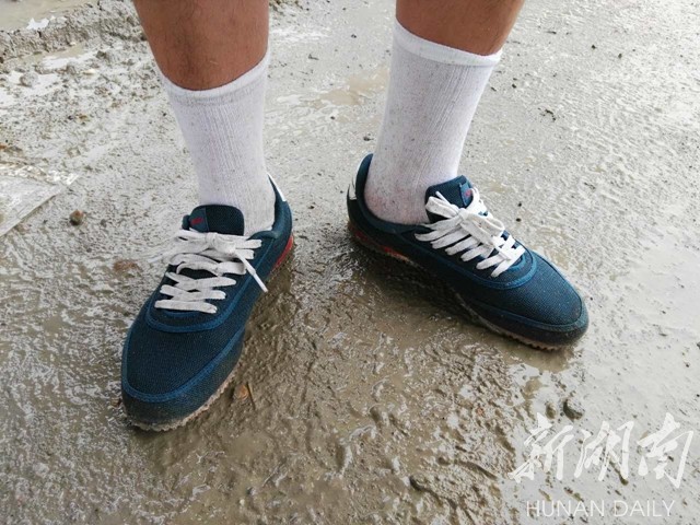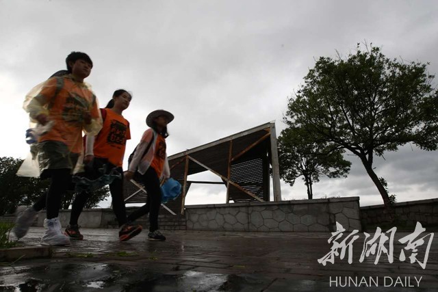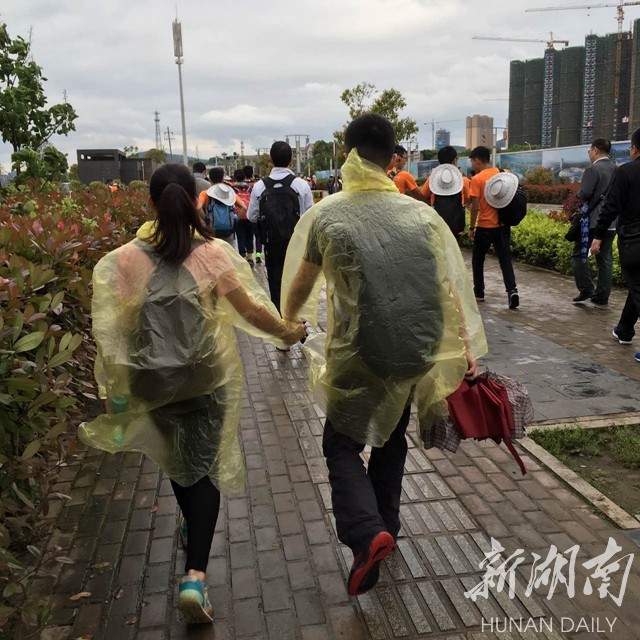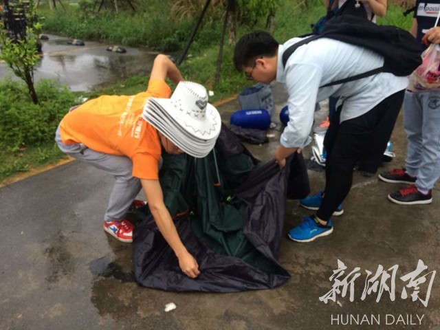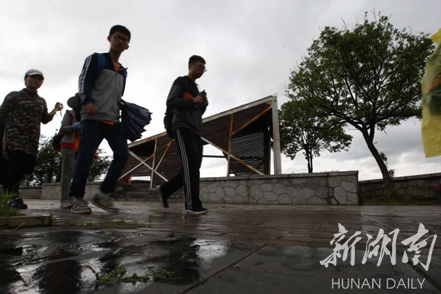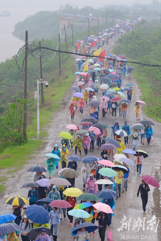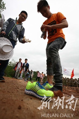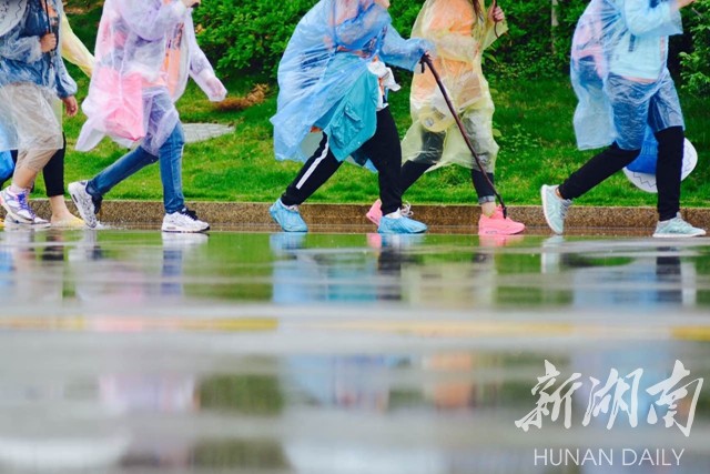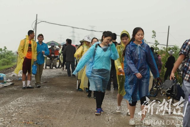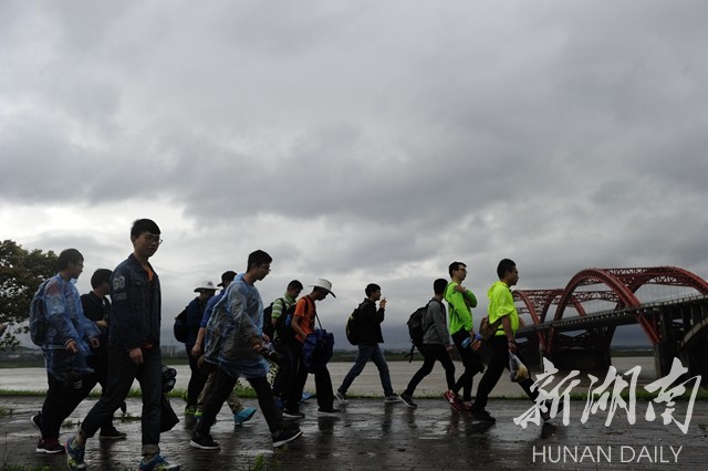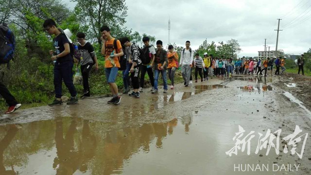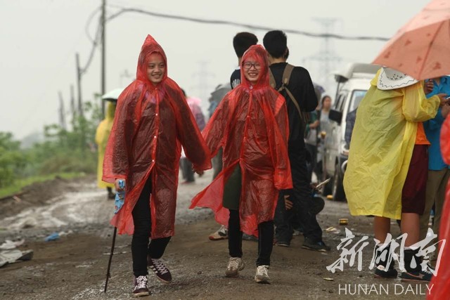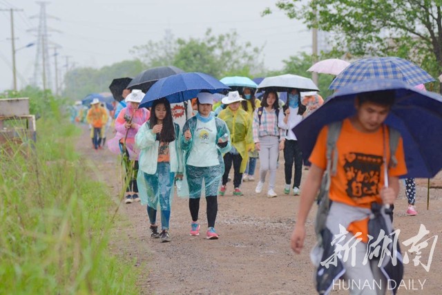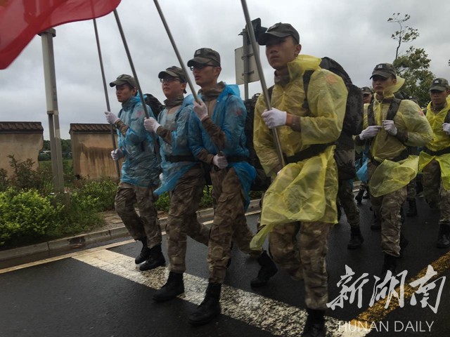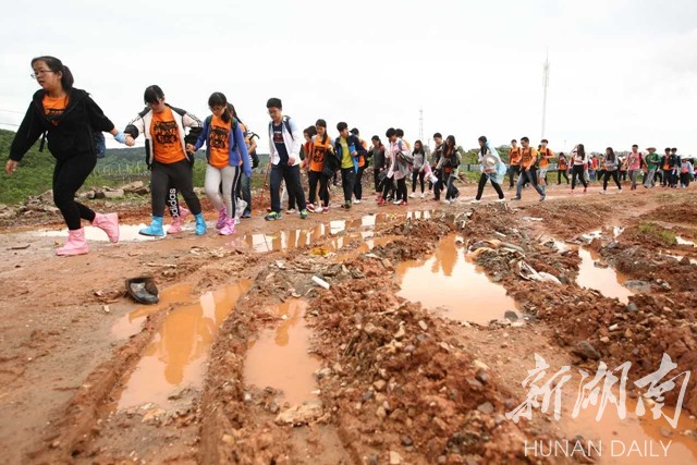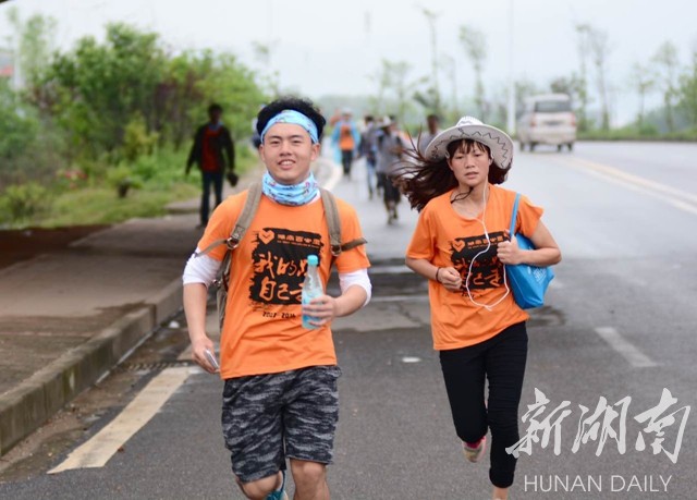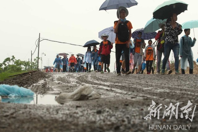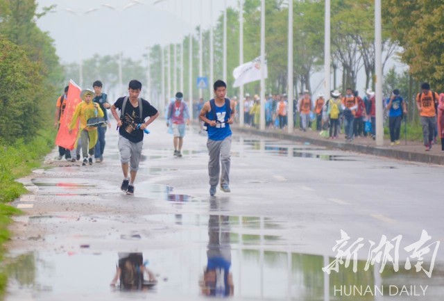 从9点多开始,又一场大雨不期而至,也让百公里的勇士们吃了很多苦头,绝大多数参与者的衣服鞋子都淋湿了。湖南铁道职业技术学院的大一新生邓锦江鞋子袜子就全部湿透。“走下来的确比我想象的困难,暴晒淋雨轮番来,又这么累。身边同学也有人想乘车或放弃,但被大家劝住了。淋湿衣服鞋子没关系,关键要守信坚持到底。”