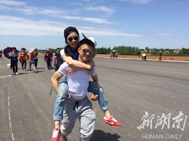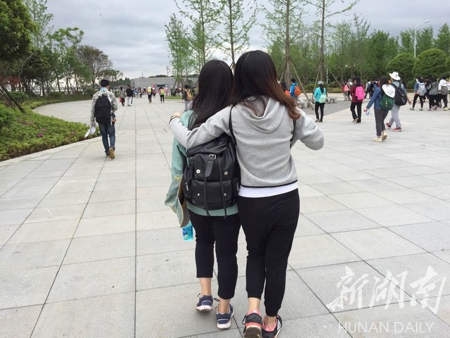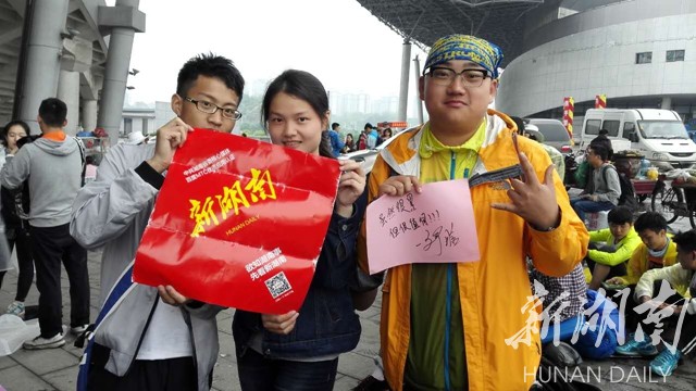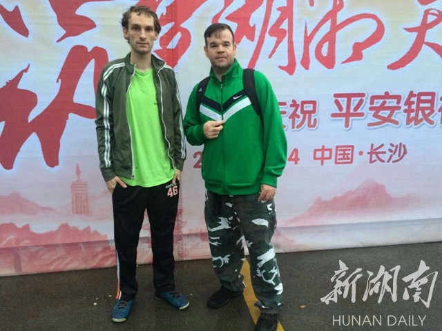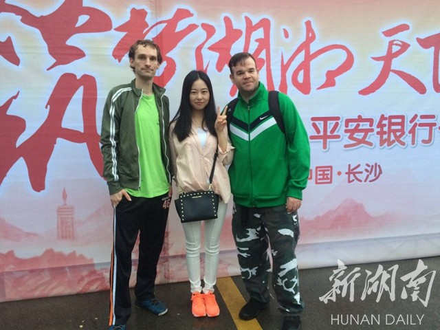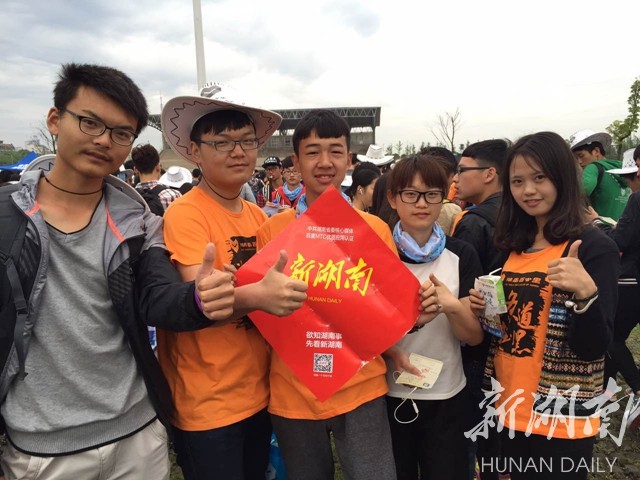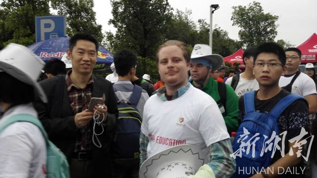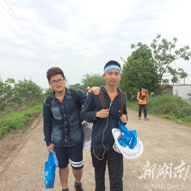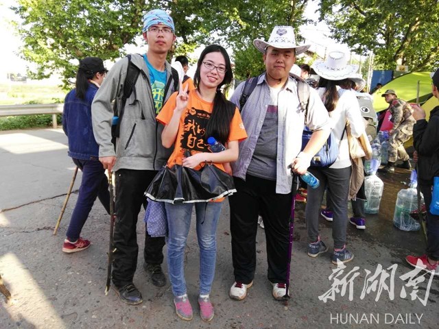“快快,帮我和他们合个影。”看到外果仁,现场的小伙伴都有点兴奋。david和Aaron都是来自美国,在长沙当英语老师,这是他们第一次参加湖南百公里。“Try my best!”david今天下午还要上课,但他要挑战自己,和伙伴们一同前行。aaron明天将回国,他也准备走20公里。“It is very good,good luck!”