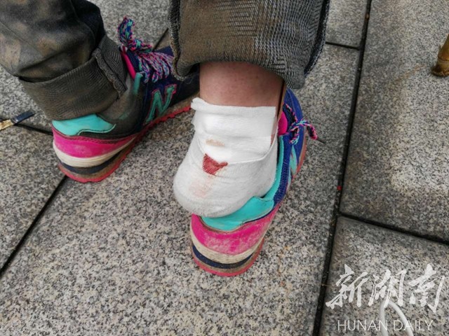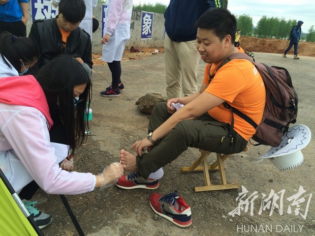 拄着木棍,拖着受伤的右脚,湖南商学院的文同学慢慢走向湖南百公里的终点。“高兴,终于走完了,但脚真的很疼。”第一天走到一半,文同学的右脚就磨出了水泡,在同学的帮助下咬牙坚持前行,走到今天脚伤加重,已经磨出了血。“这次百公里很难忘,不仅是累、受伤、走完全程,一路上同学的帮扶,更让我感动,没有他们的帮助,我走不到终点!”