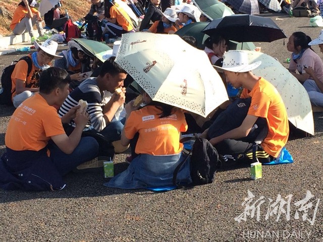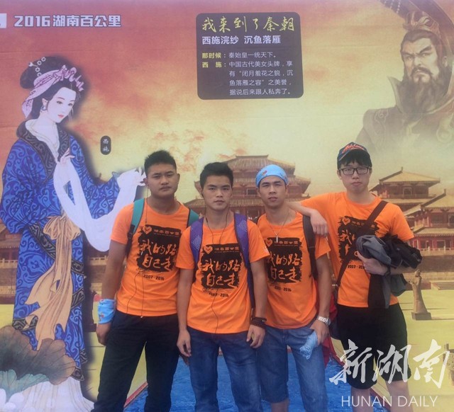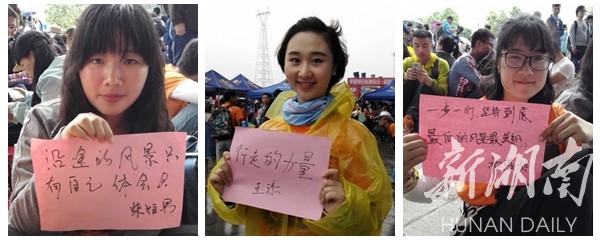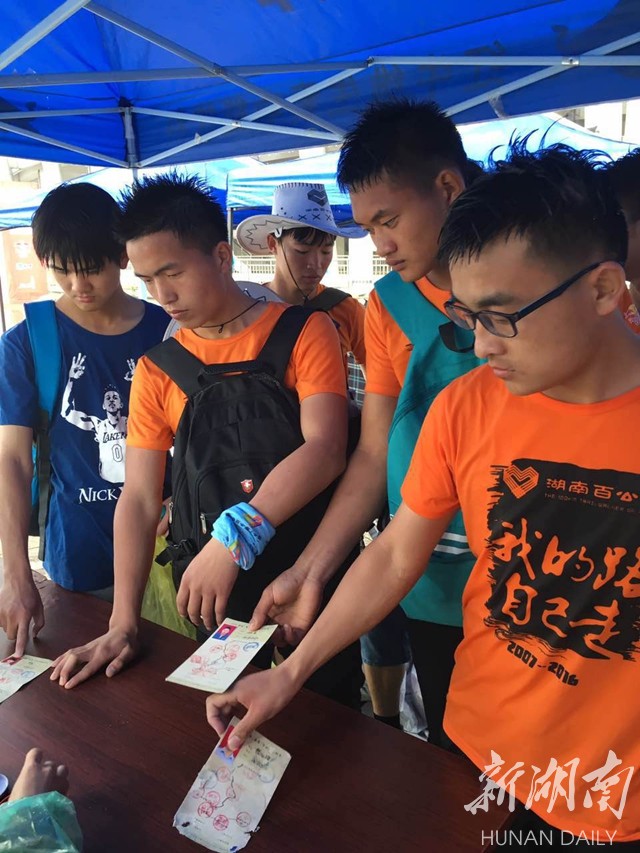 湖南商学院的文同学右脚磨出血,在同学的帮助下坚持走完全程,战胜了自己,收获了感动;林科大的王鹏邂逅明星旗手孔小平,为平哥六次徒步百公里的事迹所感染,立志“明年我也要做旗手”;湖大的陈琰是第二次参加百公里,她不仅是挑战体能,一路还宣传环保理念;还有数百位百公里的志愿者大学生和“兄弟连”,服务选手,默默奉献。