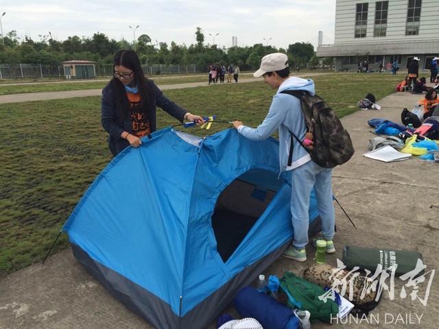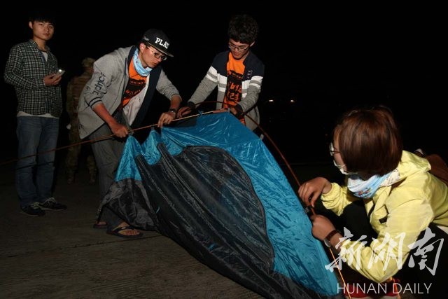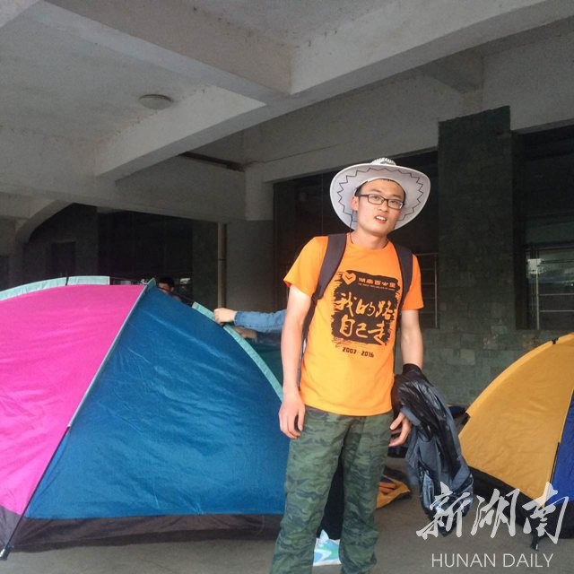有美女学妹相伴,背东西这种活当然是男同胞了。张震涵身后硕大的背包里,装着两个帐篷,吃的喝的都在里面!记者提了一下,估计五六十几斤吧!