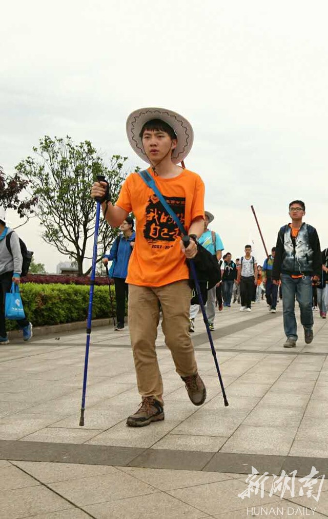 图中帅哥名叫欧习阳,由于昨天跑步摔伤了脚,他正撑着小竹竿,一瘸一拐地走着。平时走路都很少的他,虽然左脚有些不适,但依然非常乐观,表示一定会走到终点。