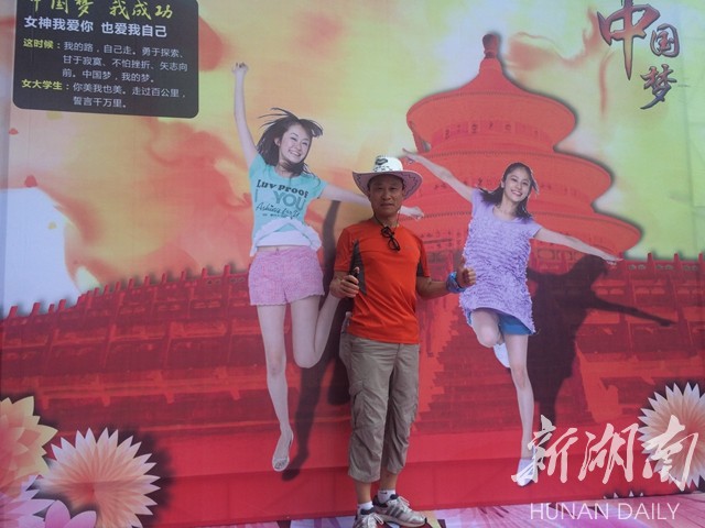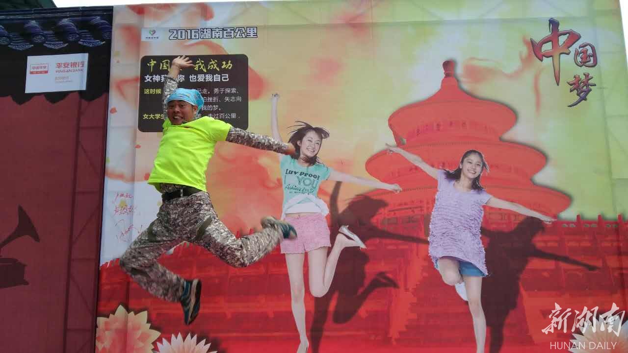 终于到达终点了,这位大叔兴奋不已,在中国梦站,挥臂高跳。他是唐孝勇,来自湖南永州,是战狼户外队的队长。
