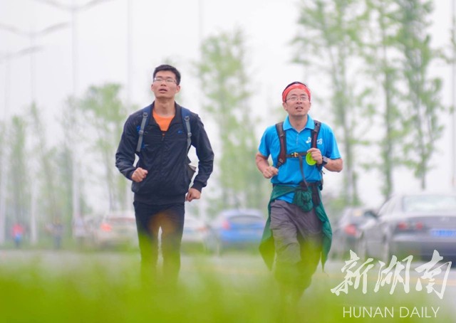 穿白色T恤快速前行的男子,是今天早上从株洲赶过来专门参加湖南百公里的,他说他争取今天又走回株洲去。
