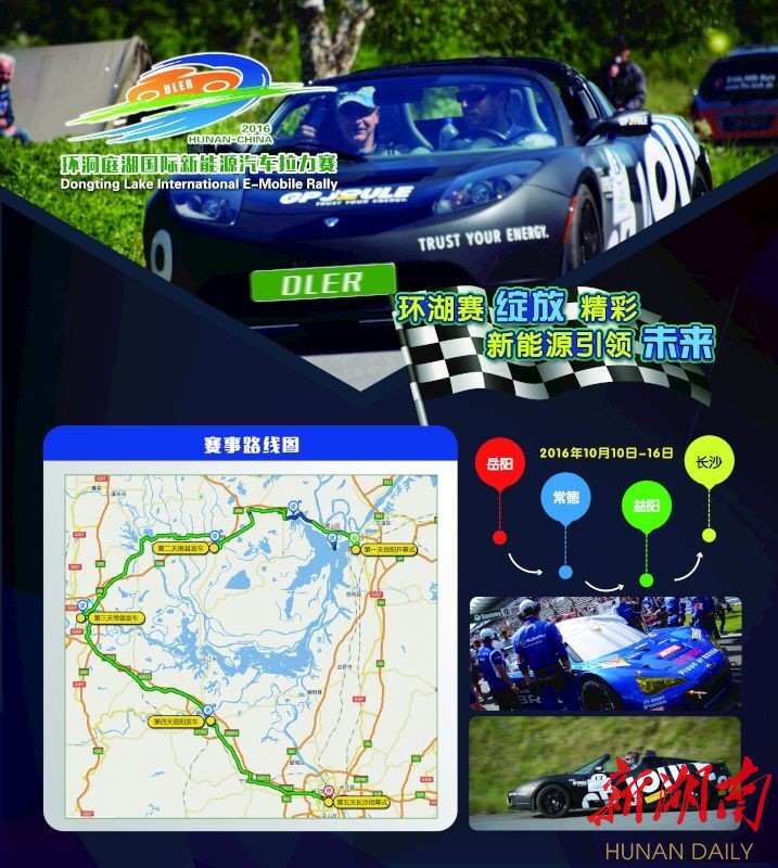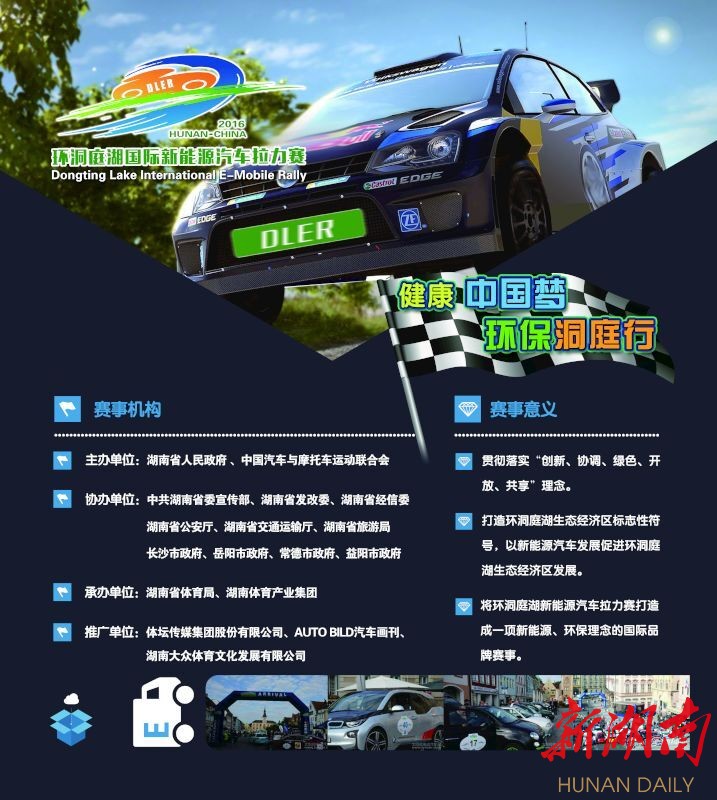 据悉,环洞庭湖国际新能源汽车拉力赛是为贯彻落实湖南省政府有关发展新能源汽车等新型运动休闲项目的要求,湖南省着力打造的一项国际性本土品牌体育赛事。该项赛事拟从2016年起,连续五年在环洞庭湖经济生态区(长沙、岳阳、常德、益阳)。赛事由湖南省人民政府、中国汽车摩托车运动联合会主办,湖南大众体育文化发展有限公司负责具体赛事的执行工作。