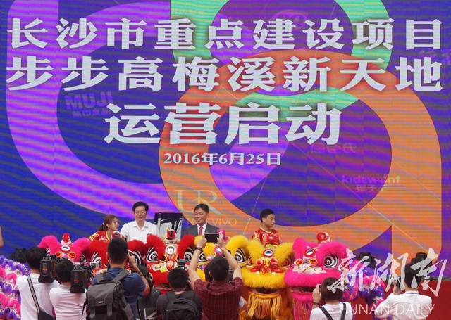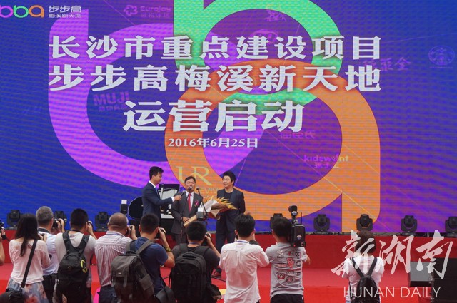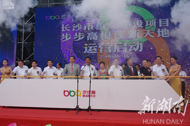 当日,由步步高集团斥资50亿元打造的国内首家商旅文概念城市综合体,长沙市重点工程项目——步步高·梅溪新天地正式启幕,副省长何报翔、长沙市委副书记、市长胡衡华等省市区各级领导和步步高董事长王填等一同出席并见证了这一隆重的时刻。