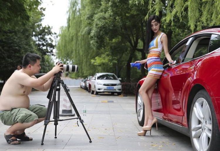2016年6月19日,长沙月湖公园,吴春怡正在拍写真,当日天气炎热,一旁的摄影师光着膀子。