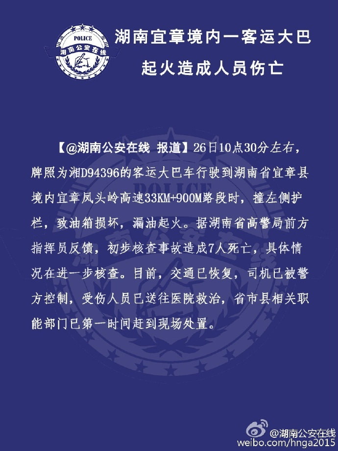 另据@湖南交通频道官方微博,事故车辆车牌为湘D94396,从湖南耒阳出发去莽山旅游,属于耒阳市骏达旅游公司,是撞上护栏并引发起火。